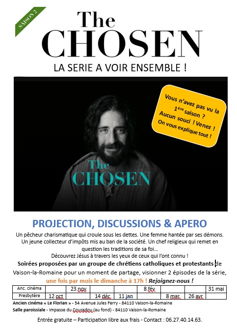 Soirées proposées par un groupe de chrétiens catholiques et protestants de Vaison-la-Romaine pour un moment de partage, le dimanche à 17h avec 2 épisodes !